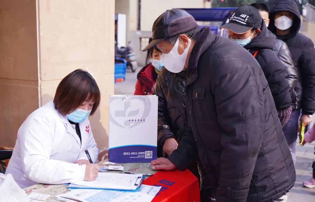 12月29日上午,在北城世纪城鸿徽苑住宅广场,市民们自觉排队,戴好口罩,简单登记姓名、联系方式等个人信息后,便可顺利领取由合肥佰惠长荣医院所准备“暖心小药包”一份,里面含有10片“布洛芬”。负责发放药品的医生一边详细介绍药品功能和服药注意事项,一边细心叮嘱对症合理用药、科学就医。