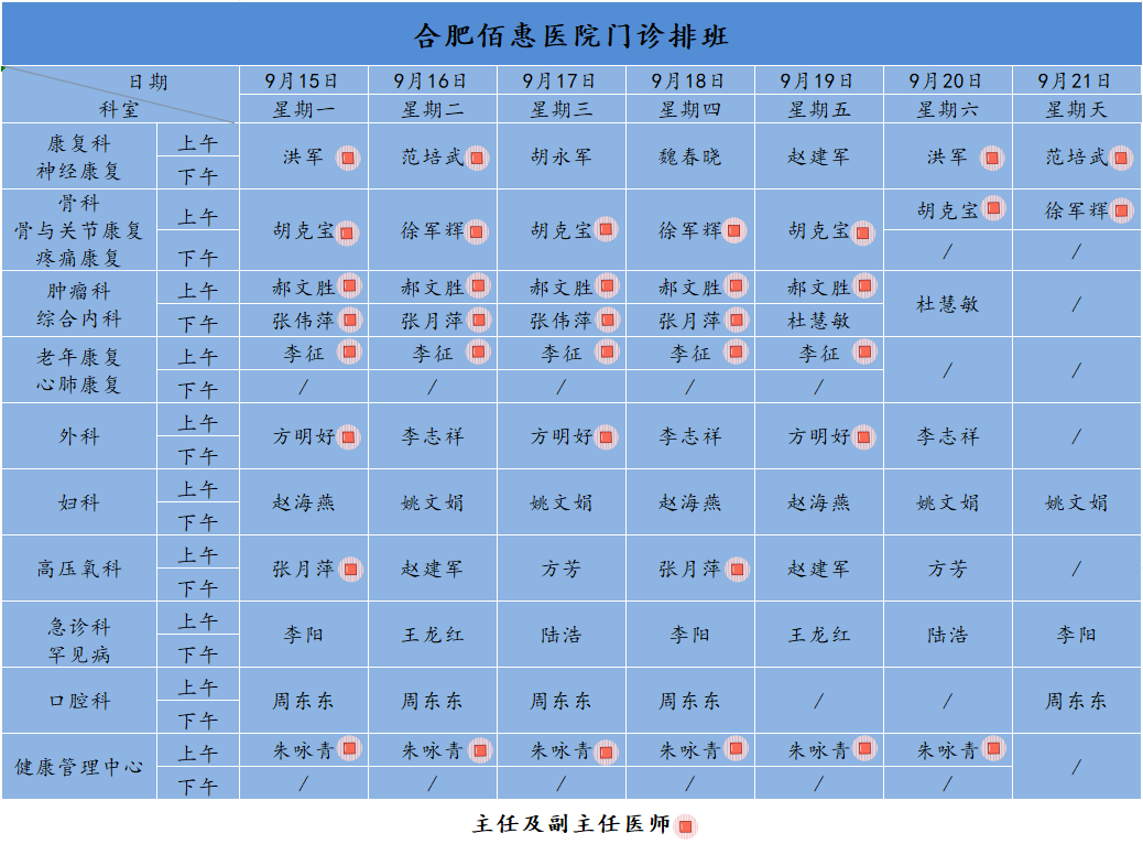 为方便广大市民了解合肥佰惠医院门诊医师出诊安排,现发布本周(9月15日-9月21日)门诊医师排班表,请大家合理安排就诊时间。如遇停诊、换诊等特殊情况有所调整,以当日出诊安排为准,造成不便敬请谅解!