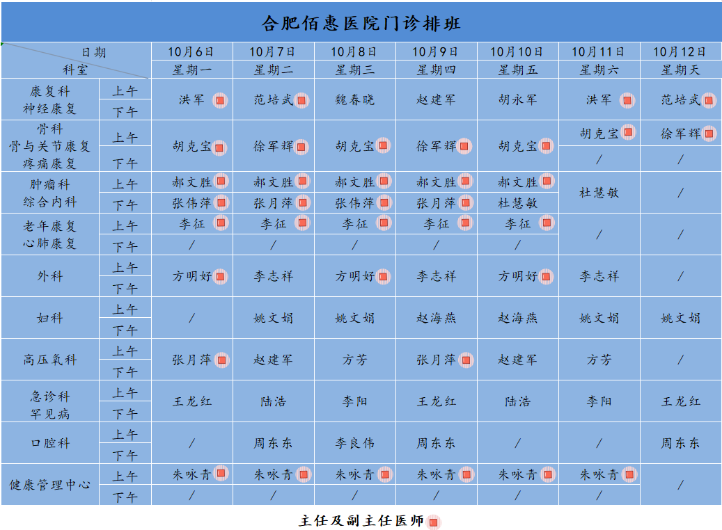 为方便广大市民了解合肥佰惠医院门诊医师出诊安排,现发布本周(10月6日-10月12日)门诊医师排班表,请大家合理安排就诊时间。如遇停诊、换诊等特殊情况有所调整,以当日出诊安排为准,造成不便敬请谅解!