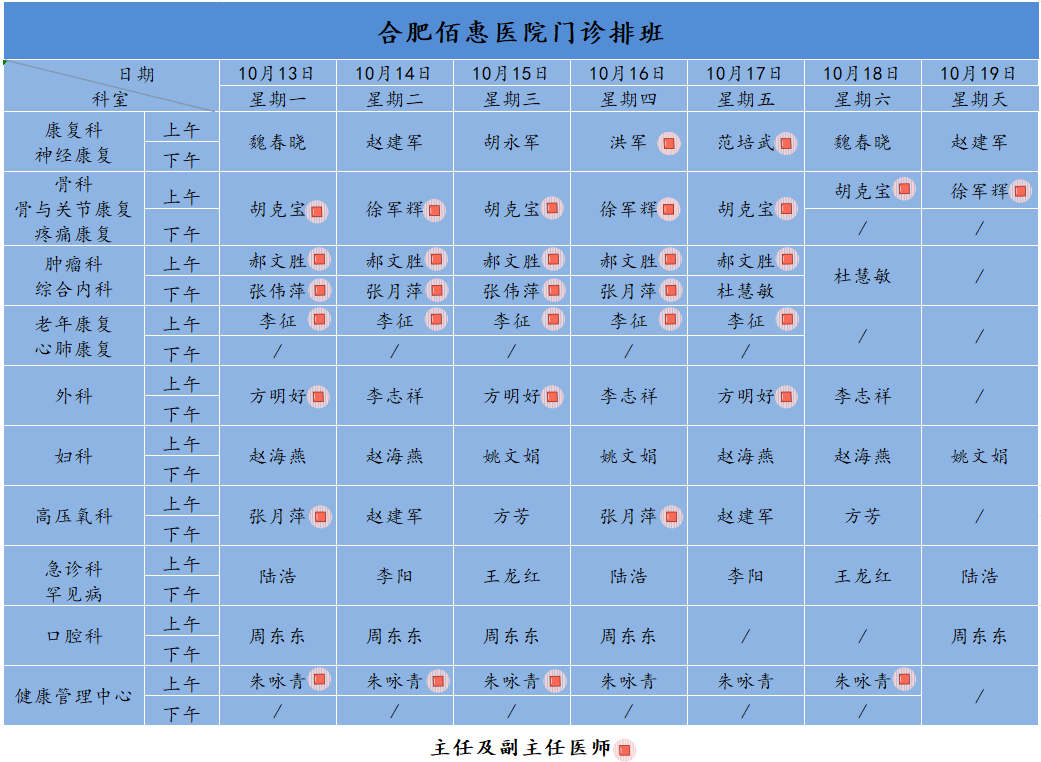 为方便广大市民了解合肥佰惠医院门诊医师出诊安排,现发布本周(10月13日-10月19日)门诊医师排班表,请大家合理安排就诊时间。如遇停诊、换诊等特殊情况有所调整,以当日出诊安排为准,造成不便敬请谅解!