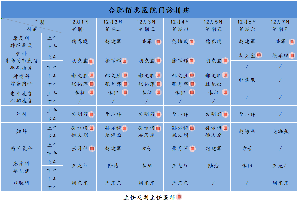 为方便广大市民了解合肥佰惠医院门诊医师出诊安排,现发布本周(12月1日-12月7日)门诊医师排班表,请大家合理安排就诊时间。如遇停诊、换诊等特殊情况有所调整,以当日出诊安排为准,造成不便敬请谅解!